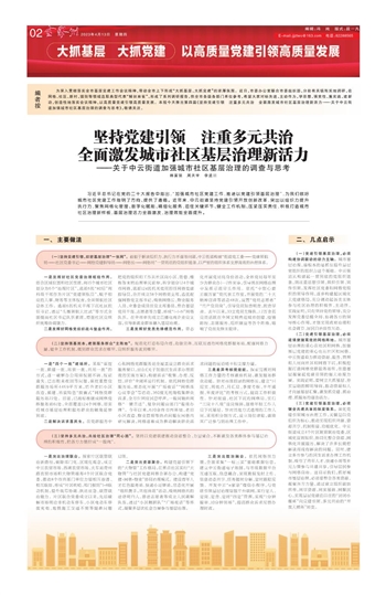 为深入贯彻落实全市基层党建工作会议精神,带动全市上下形成“大抓基层、大抓党建”的浓厚氛围。近日,市委办公室联合市委组织部,分赴有关镇街实地调研,在网格、社区、新村、镇街等领域选取典型代表“解剖麻雀”,形成了系列调研报告,供全市各级各部门单位参考,希望大家对标先进、主动作为,学思想、强党性、重实践、建新功,创造性地落实会议精神,以高质量党建引领高质量发展。本报今天推出第四篇《坚持党建引领 注重多元共治 全面激发城市社区基层治理新活力———关于中云街道加强城市社区基层治理的调查与思考》,敬请关注。