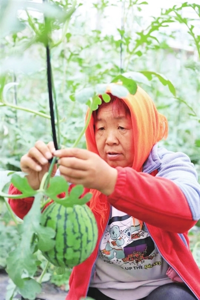 据介绍,在西瓜生长过程中,袁可花大胆尝试,一改以往露天种植的传统,让西瓜“住”进阳光房,在“空中”生长结果。这样的种植方式,既避免西瓜和地面接触生病,又能充分利用空间,保证了通风透光,有利于西瓜生长和增加甜度,让西瓜皮薄瓤甜,成熟后也便于采摘。