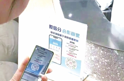 “你有‘胶信分’吗?”“有。”“你扫一下二维码看看,现在店里的活动是打七折,如果你有‘胶信分’的话可以打六折。”服装店售货员张福霞正与前来购买服装的市民宣传“胶信分”活动。