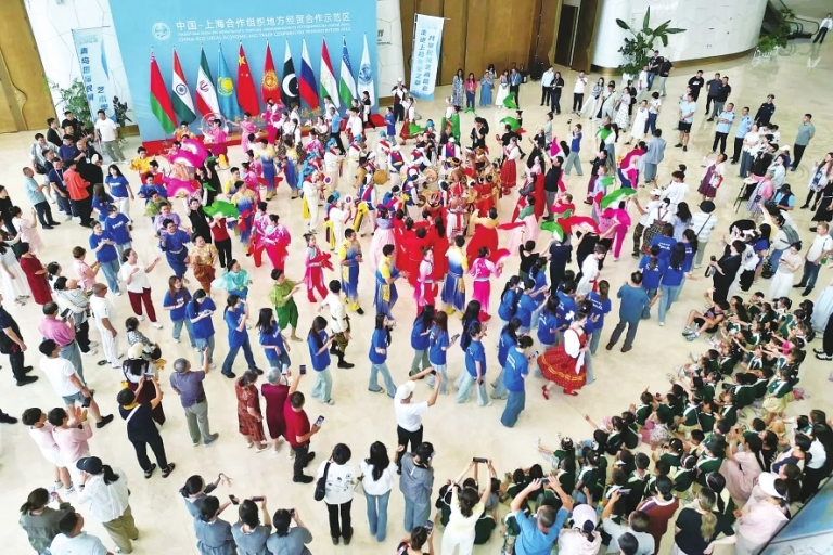 此外,胶州空竹协会表演的抖空竹也巧妙融合了本土文化特色,赢得了现场观众的阵阵掌声。活动最后,身穿各国民族服饰的艺术家们围成同心圆欢乐起舞。在场的市民、游客自发加入,青岛·上合之珠国际博览中心展览馆瞬间变成欢乐的海洋。这一刻,文化的共鸣超越了语言的界限。