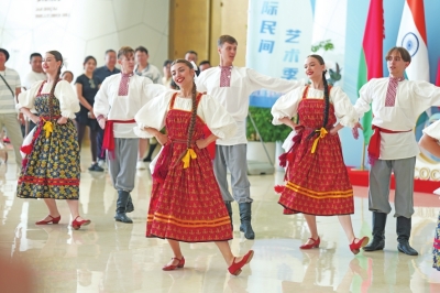 活动现场,由俄罗斯拉兹多利耶民间舞蹈艺术团以热情奔放的节奏点燃了现场气氛,舞者们踏着欢快的舞步,将俄罗斯民族的豪迈与活力展现得淋漓尽致。现场观众被他们的热情感染,不少人随着音乐节奏轻轻摇摆。