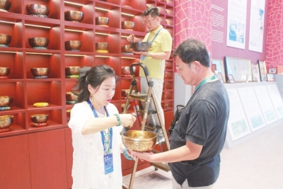 “您面前的是我们的一款‘足入式’颂钵,可以站到这个里面感受一下。”在同样位于B区的尼泊尔馆入口处,记者看到,尼泊尔颂钵文化体验中心工作人员正在向一位嘉宾演示颂钵的妙处。